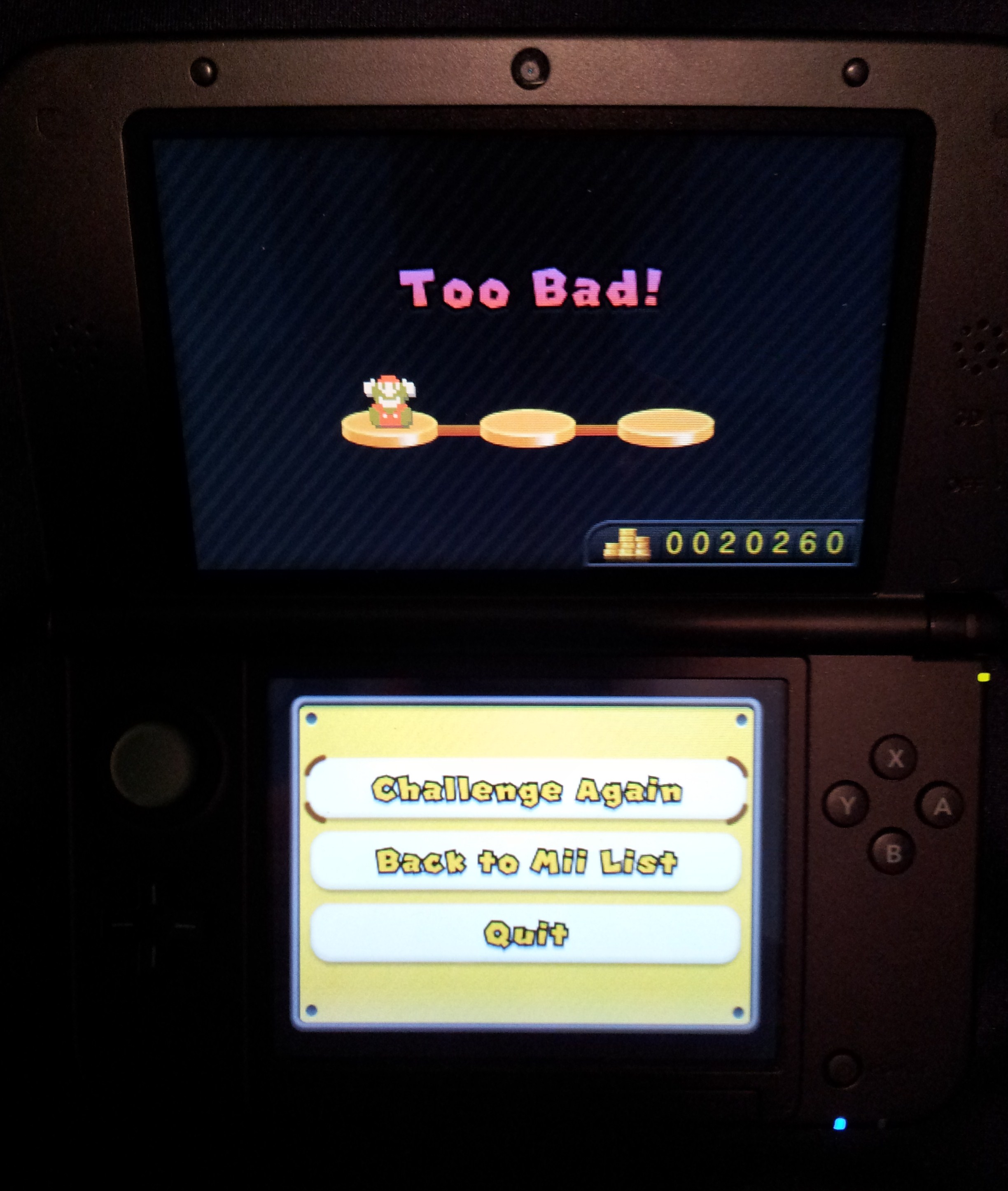 I finished NSMB2 after three days of intermittent playing. Though I missed the majority of the secrets, the game’s six main worlds (there are nine in total) didn’t take long at all to breeze through. Luckily the game packs some long-term appeal, especially to its more “hardcore” players, in the form of two modes not present in the first DS game. That co-op mode is a very nice addition as it adds a bit of an awkward twist to every section of every level, while doubling the coin total you amass while playing. The second new addition is genius in its simplicity, and even though I suck at it the appeal is very easy to see. Coin Rush gives you just one life (aaarrrgghh) to run through three levels collecting as many coins as you can in as little time as possible, after which the game saves your score and sends it out as Streetpass data to any would-be challengers you walk by while you’re out. Receive some Coin Rush data and the game sends you straight into the same level pack the passer played and then taunts you, compelling you to beat his or her score.