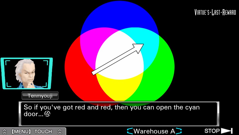 Virtue’s Last Reward is broken into two types of gameplay (three if you count every time you have to make that terrible aforementioned decision, which is a mind game of its own). Most of the game is made up of “novel” sections, which develop the story through large blocks of text punctuated by animated character models, countless diagrams and the odd drawn cutscene. The other part of the experience is the most “gamey” part: a series of rooms from which you have to escape by completing a series of linked puzzles. These puzzles take on a point-and-click adventure style and they are immensely satisfying to complete. The challenges they present are never too steep, as everything can be approached in a rather logical fashion once you twist your brain to think the way it wants you to. No puzzle is repeated unless actually necessary for the sake of story and the nature of the puzzles varies quite widely.
