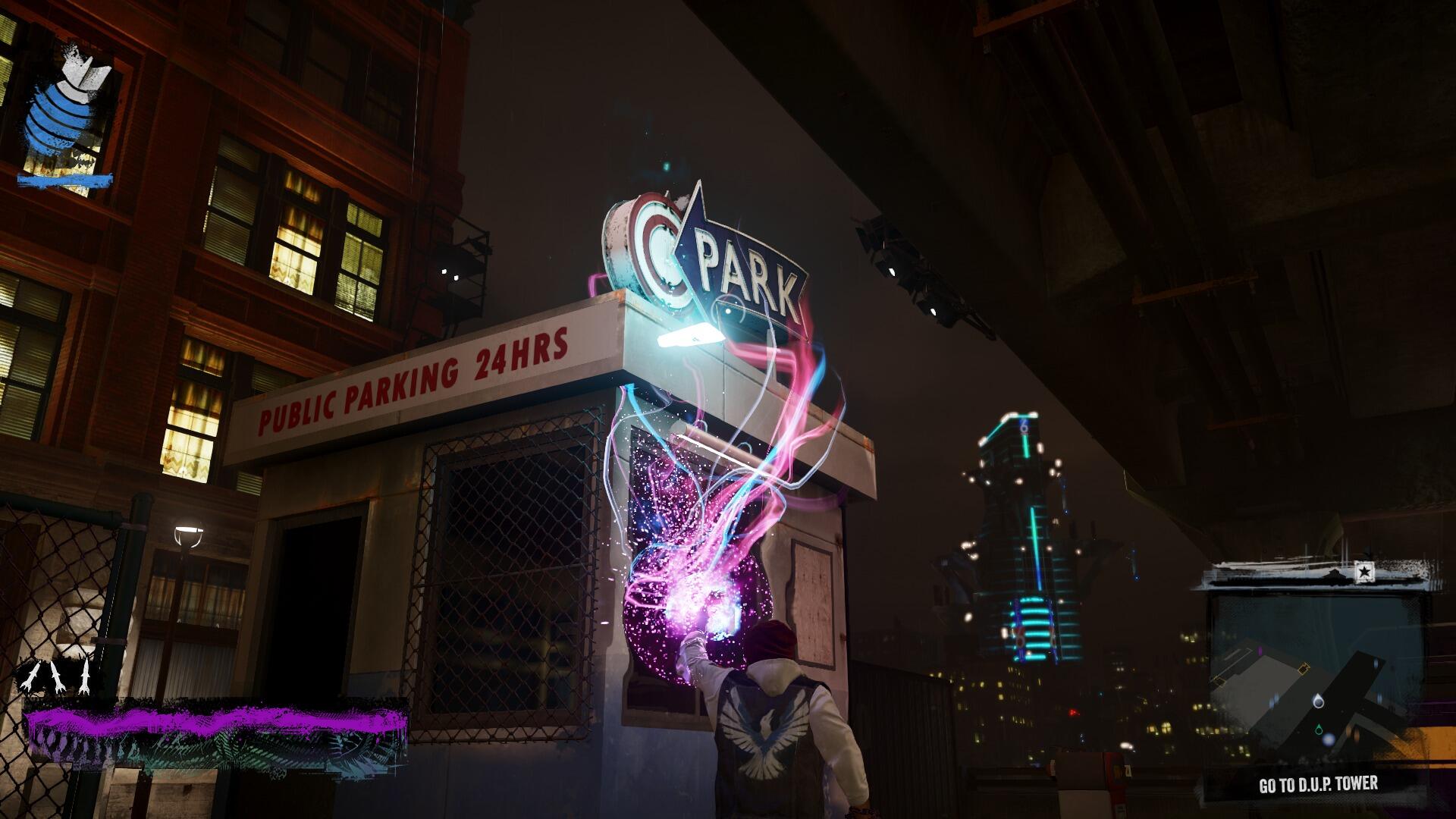 The first two powers, smoke and neon, were the only ones the public knew about before the game launched, so I won’t spoil what the others are. Yet rest assured that there is something for every combat taste present here, from defensive moves to ranged attacks to stealthy techniques to agility boosters and beyond. The powers start out looking very similar, which is a bit disappointing, but diversify quickly with both upgrades and karma levels. Augmenting your favourite powers to suit your preferences is simple once you’ve done a little exploring, which in turn is easy with the game’s power-enhanced parkour system. Because every power set is drawn from resources you can find everywhere in a modern city, recharging and switching powers on the fly is just as fluid.