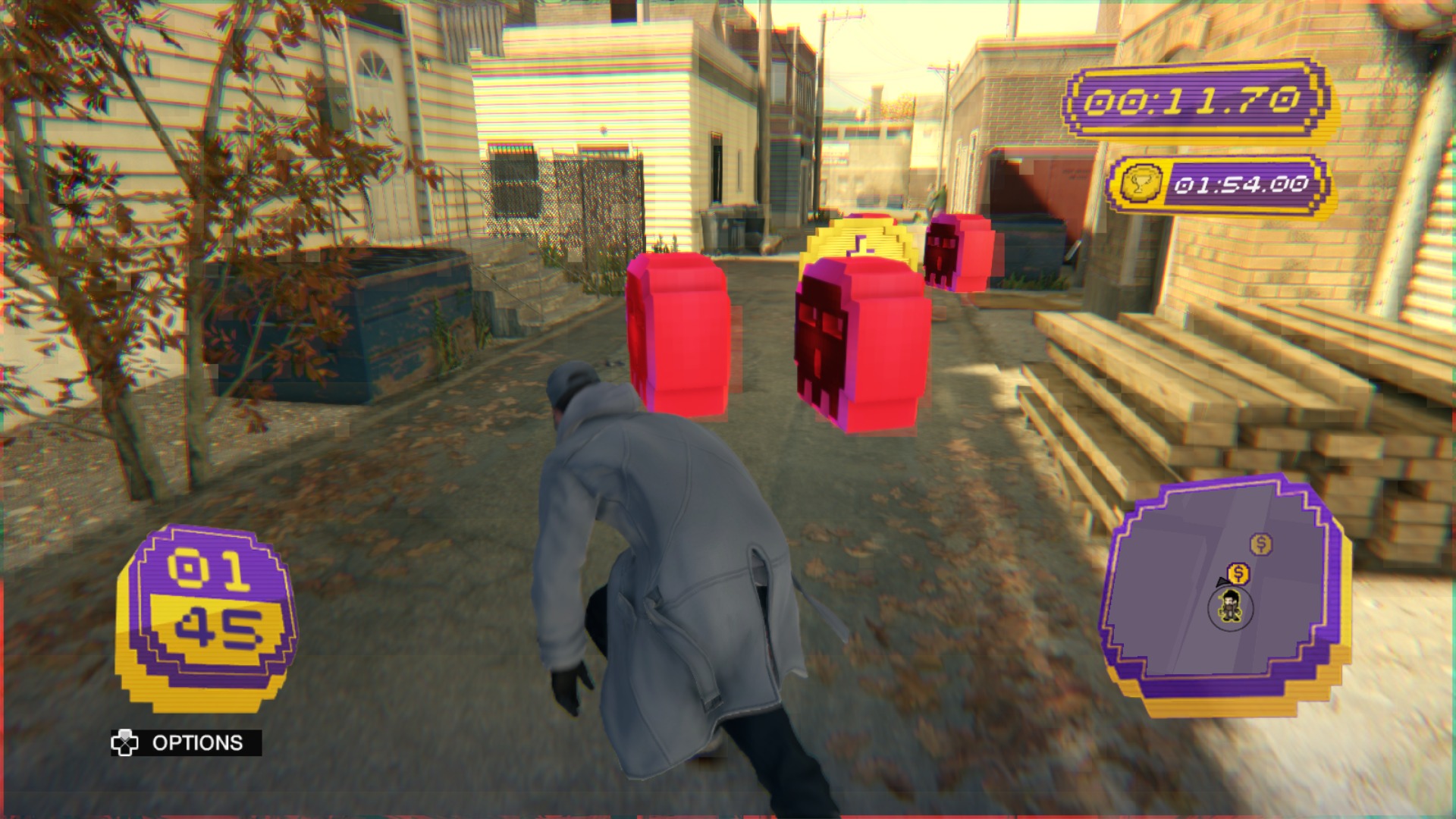 A minigame no doubt partially influenced by the artistic direction of Scott Pilgrim vs The World, the “Cash Run” missions available to you around the city involve collecting giant rotating coins, each of which explode into hundreds of sparkly squares when collected. Aiden’s parkour skills are tested by these courses, which lay themselves out bit by bit as you collect each hunk of virtual currency. Making things more difficult is the presence of several giant red floating skulls, each of which add a whopping 5 seconds to your clear time when touched. Difficult, but fun.