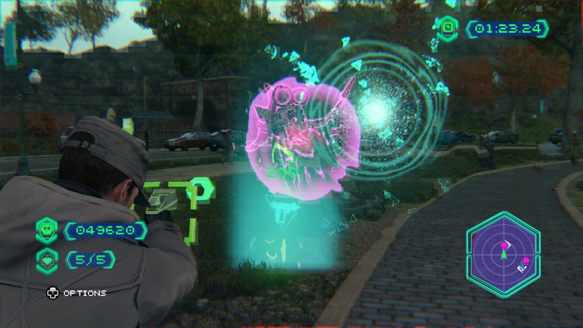 In a cool nod to the possible future of interactive entertainment that also serves as a throwback to a 1980s videogame aesthetic, the augmented reality game “NVZN” can be found at various locations around Chicago and layers Aiden’s surroundings with blocky, brightly-coloured alien portals that spew tiny targetable alien bugs. Wait too long to kill them and they will evolve, before attaching themselves to random NPCs and reproducing. There are power-ups, weapon drops and old-school bonus rounds in the surprisingly deep minigame, and reaching a certain wave will improve Aiden’s aiming in standard gameplay.