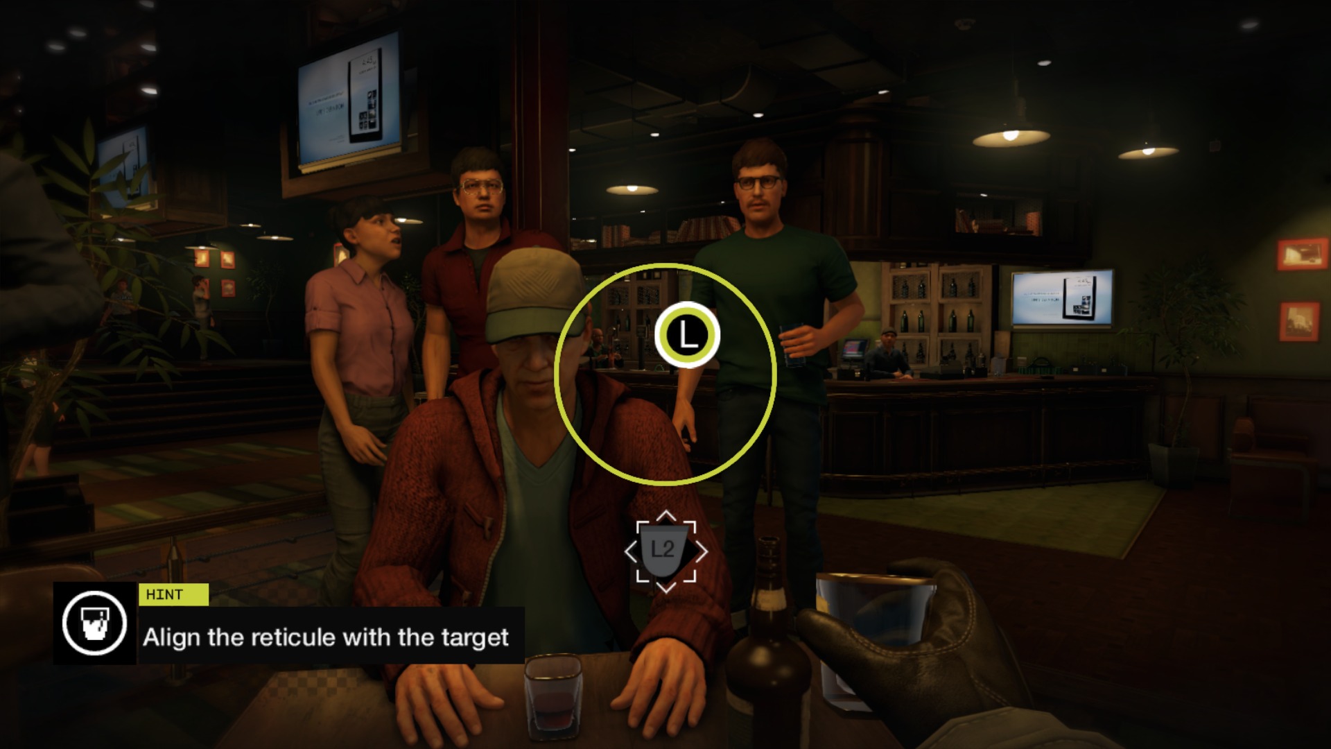 An activity that probably contributed to the R18+ rating given to Watch_Dogs by the Australian Classification Board, Aiden is able to challenge random Chicago barflies to a drinking contest, during which you need to keep a colour-coded, unpredictable moving circle inside a larger circle for long enough to, I guess, gather up the courage to slam down a glass of hard liquor. The controls change up slightly as the game gets more difficult, and there is gambling money to be won if you are successful.
