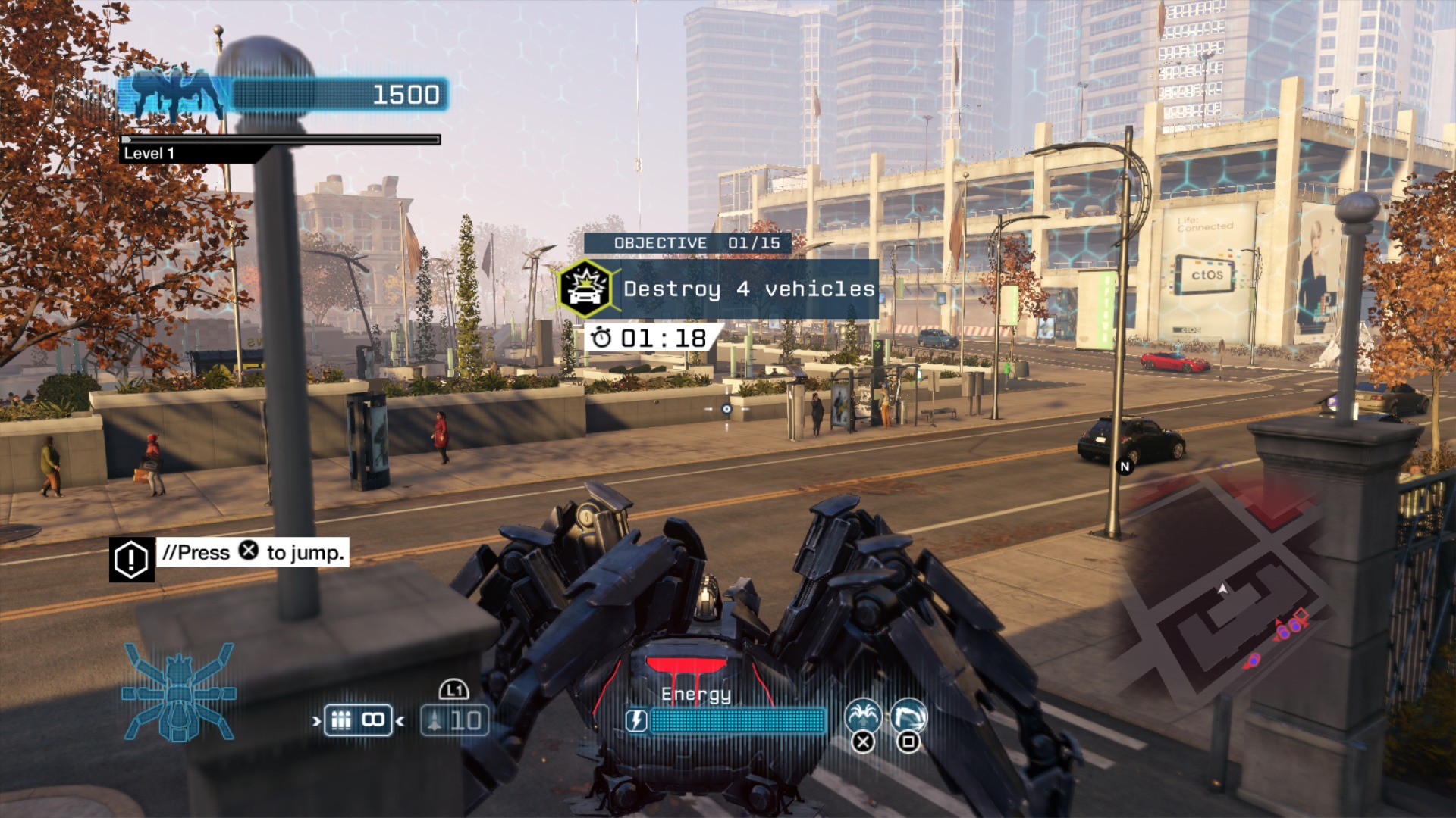 By far the best of the game’s minigames if you ask me comes in the form of a power trip to end all power trips. The game sections off a quadrant of the main city and sets you loose on its inhabitants inside a badass spider tank, armed with a chaingun, a number of explosive shell rounds, a brutal front claw melee attack and a powerful jump to evade attackers. The behemoth under your control can even climb straight up the side of buildings, which is just incredibly cool. Everything you do takes a chunk out of the same energy meter, meaning you must balance offense with the ability to flee in a tight spot. As you complete destruction objectives and demolish vans, helicopters and cars alike, your tank levels up and you can choose how you want to strengthen it on the way to your final goal. The whole thing is over way too quickly, but score-chasing has already brought me back to it more than once.