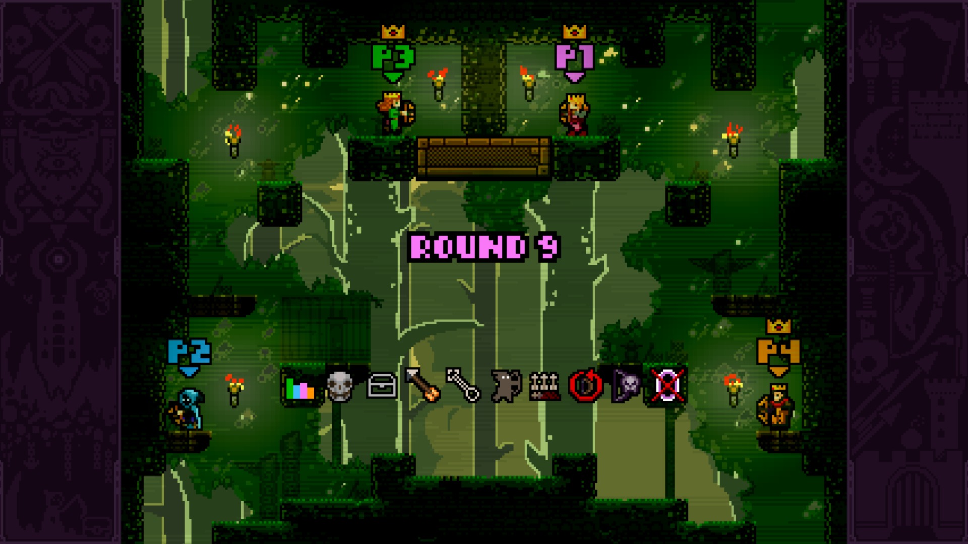 Matches take place across several variants of a single themed stage, all fitting into a single static screen. Rounds are decided by either accumulated kills or number of rounds survived, depending on player settings, with team battles as an option as well. That isn’t where the customisation potential ends, however, which is part of Ascension‘s lasting appeal. You can customise the amount of arrows each player starts with (even choosing to give certain players handicapped advantages), turn off certain arrow types and pickups, set only one type of power-up available, tweak the types of item chests that appear, give everyone really slippery shoes, make accidentally firing an empty bow punishable by death and much, much more.