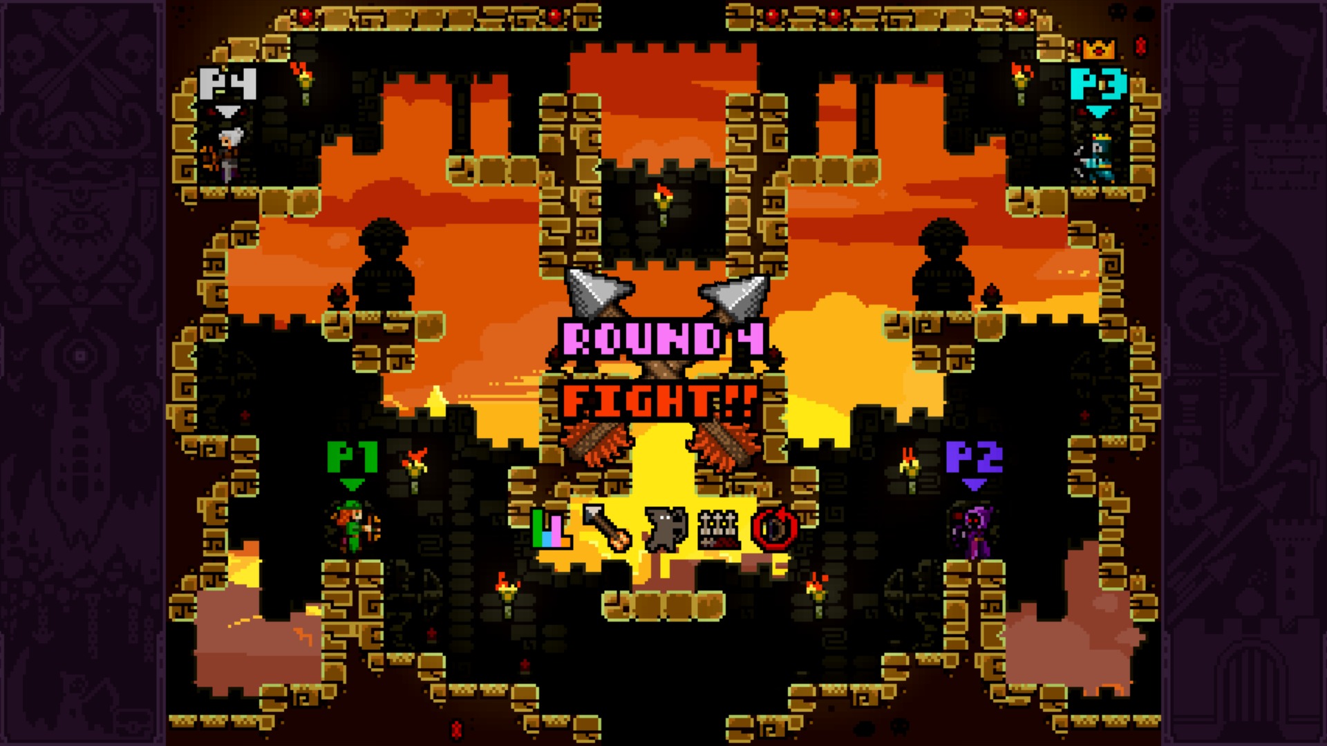 Kill or be killed is pretty much the name of the game for the fast-paced flow of Towerfall Ascension. All players have a limited number of buttons with which to play, though the simple controls mask some surprising tactical depth. Lining up a perfect shot while predicting your opponents’ moves is one thing, but the inclusion of a dodge move that grants a second of invincibility while also catching any incoming arrows ups the tension and the combat options. Advanced positioning techniques involving crouches, wall jumps and the like are possible, and the most satisfying of kills can easily be saved and shared using the PS4’s built-in capture functionality. In my experience highlights seem to happen for everyone, regardless of their play history and gaming experience, which is a testament to Towerfall‘s balanced accessibility.