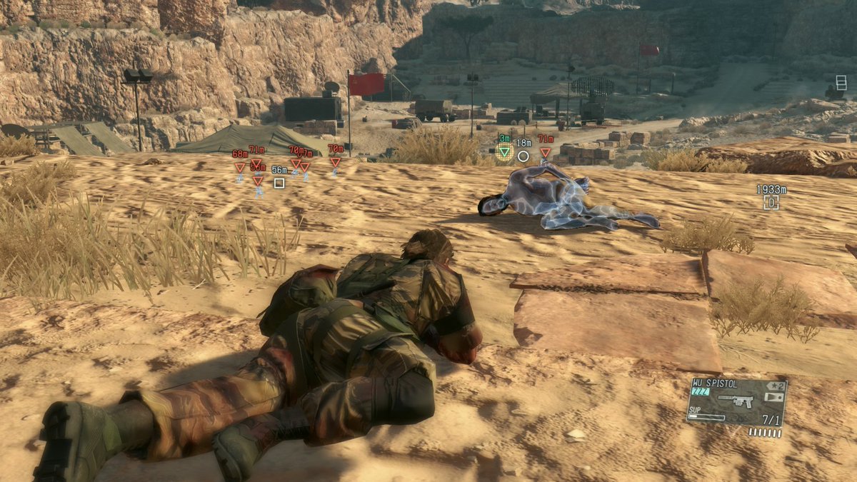 Everyone who has given Metal Gear Solid V a good shake has a war story or two to tell – a moment when a perfectly executed plan went off without a hitch, or perhaps when a player discovered something they didn’t even think they could do, or, more likely, when everything just turned pear-shaped and some unexpected results came from the ensuing chaos. My personal favourite is hardly ground-breaking or uncommon, but illustrated to me just what is so special about Hideo Kojima’s last-ever Metal Gear game. While on an early mission to retrieve a hostage at the far end of a gigantic open crater, I found a densely-populated route down the right-hand edge to be frustratingly unsuccessful for me stealth-wise. So eventually I got fed up and tried sneaking around the left, getting much further before accidentally extracting a guard too close to one of his colleagues. I blew my cover and dashed towards the underground safe haven at the far end, but then realised I might compromise the hostage by doing so. Mid-run I changed direction, diving towards the crater’s dead-centre where the enemies could see me disappear. From there I waited for them to enter their searching phase, crawled away back to the right edge (where there were no longer any guards whatsoever), and basically strolled to the cave unchallenged. Now behind the hostage, I took out one lone guard, threw some dead ammo to distract another one and get him to join his mates in the middle, then crawled up to the completely unattended hostage to extract that sucker. This is the kind of stuff that happens regularly in Metal Gear Solid V.