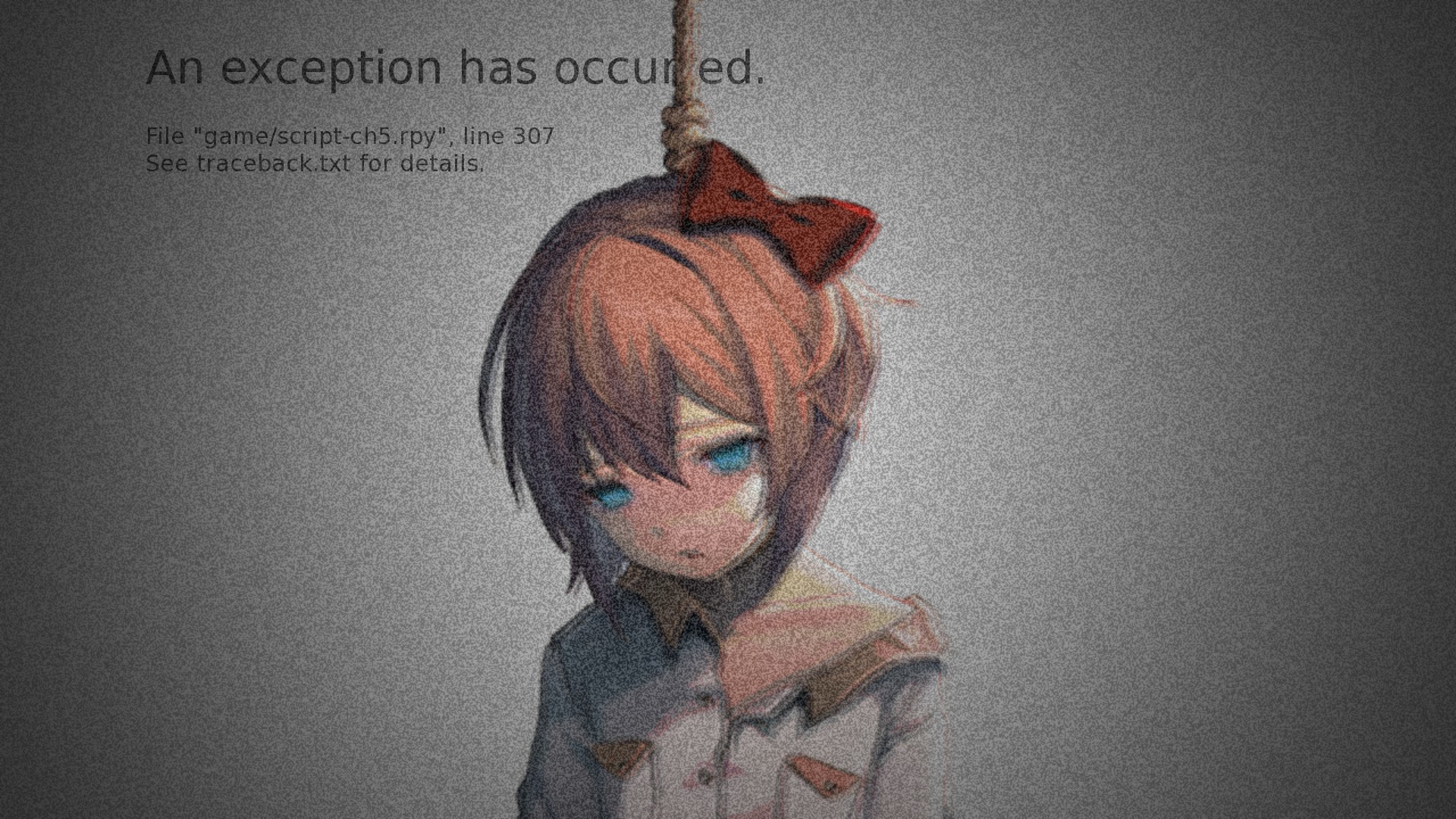 Wow. How do you even talk about Doki-Doki Literature Club and what makes it so refreshingly, horrifyingly unique? Well, being able to spoil it on a page like this is a good start. Here’s a game that “rewards” (if you can call it that) the kind of player who obsessively checks options menus before starting a game. I am one such player, so when the game’s slightly buried manual casually reminds you that Steam/your device’s OS lets you check a game’s source files, best believe things start to get real interesting. Right around the time this cutesy visual novel / dating sim drops its first out-of-place piece of dialogue, a disturbing image file appears in the game’s directory called “Hxppy Thxughts”. It is not a happy image, and when a much clearer version of that image appears in the main game, showing the hanging corpse of the protagonist’s childhood friend no less, error messages and glitches assault the screen. One asks you to check out a file called ‘traceback.txt’, which smuggles in a strange message about “deleting” the suicidal character. From there, the hooks are in, and things start to get really gripping – and messed up.