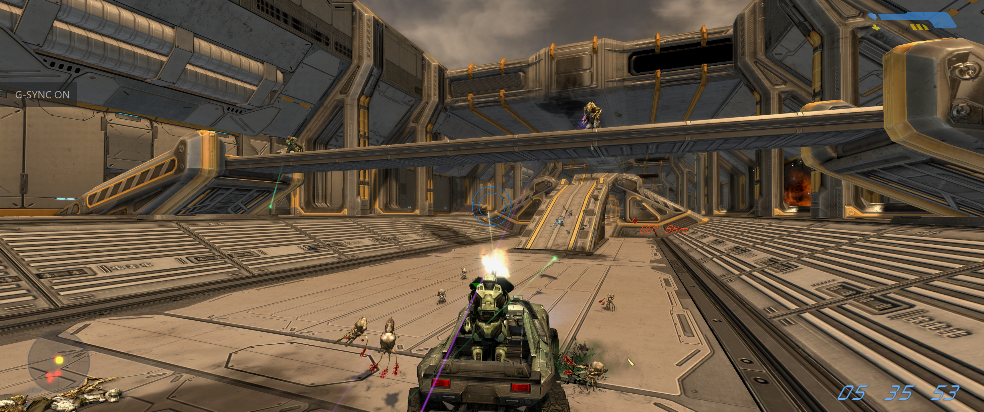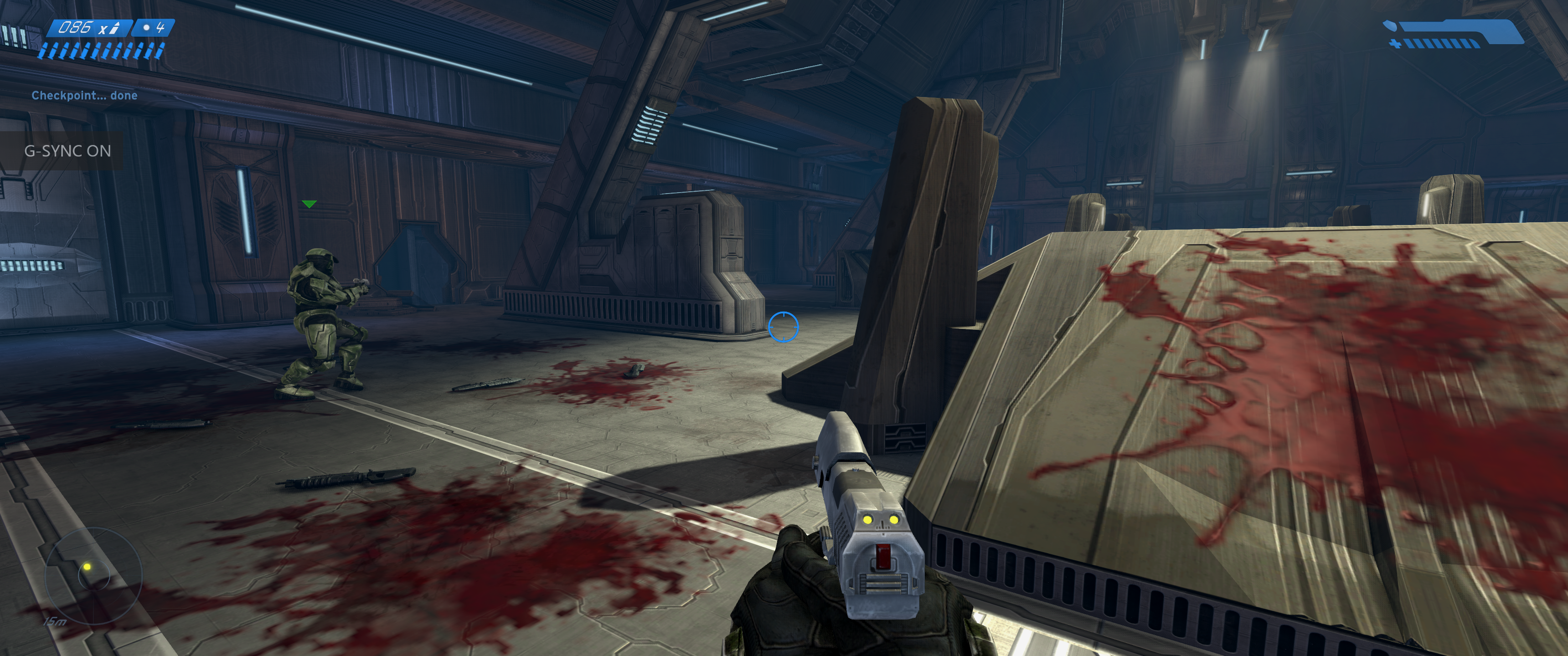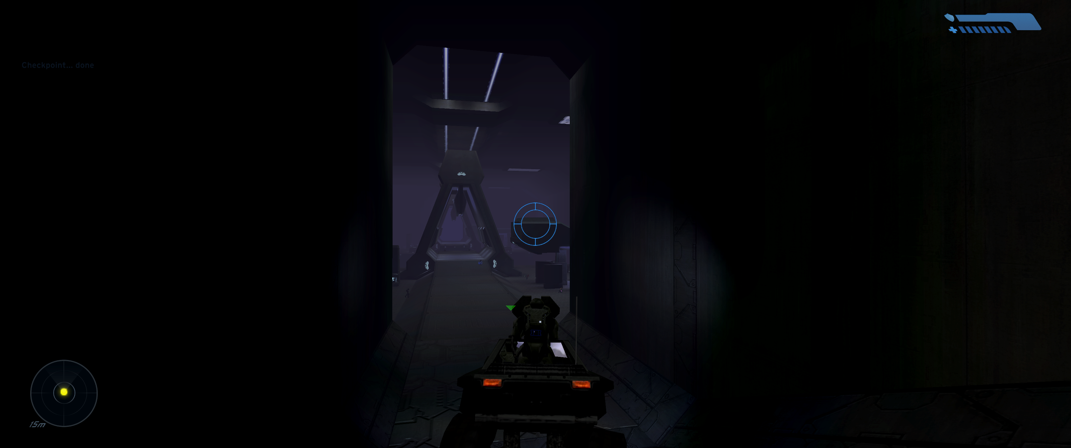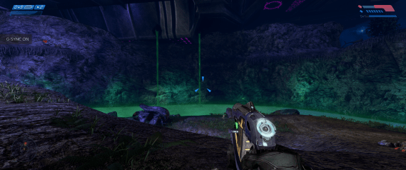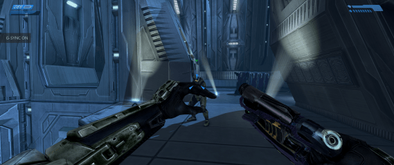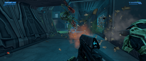 Much like Reach enjoyed as part of the PC Master Chief Collection, the OG Halo supports ultrawide resolutions and adds some graphical flourishes on top of the existing graphical presentation. In this case, however, the port in question is based off an existing remake: 2011’s Combat Evolved Anniversary. So that release’s most mind-blowing feature – the ability to switch between the original Halo visuals and the remade assets – survives the transition with some rather bizarre results. Not only can you now play the first Halo game in an aspect ratio almost twice its original width, but in a few interior locations the newer lighting effects layered on the old textures give proceedings a uniquely grim and foreign atmosphere. These moments arguably work better than they do with the new graphics to establish the foreboding mood surrounding an unknown alien installation.