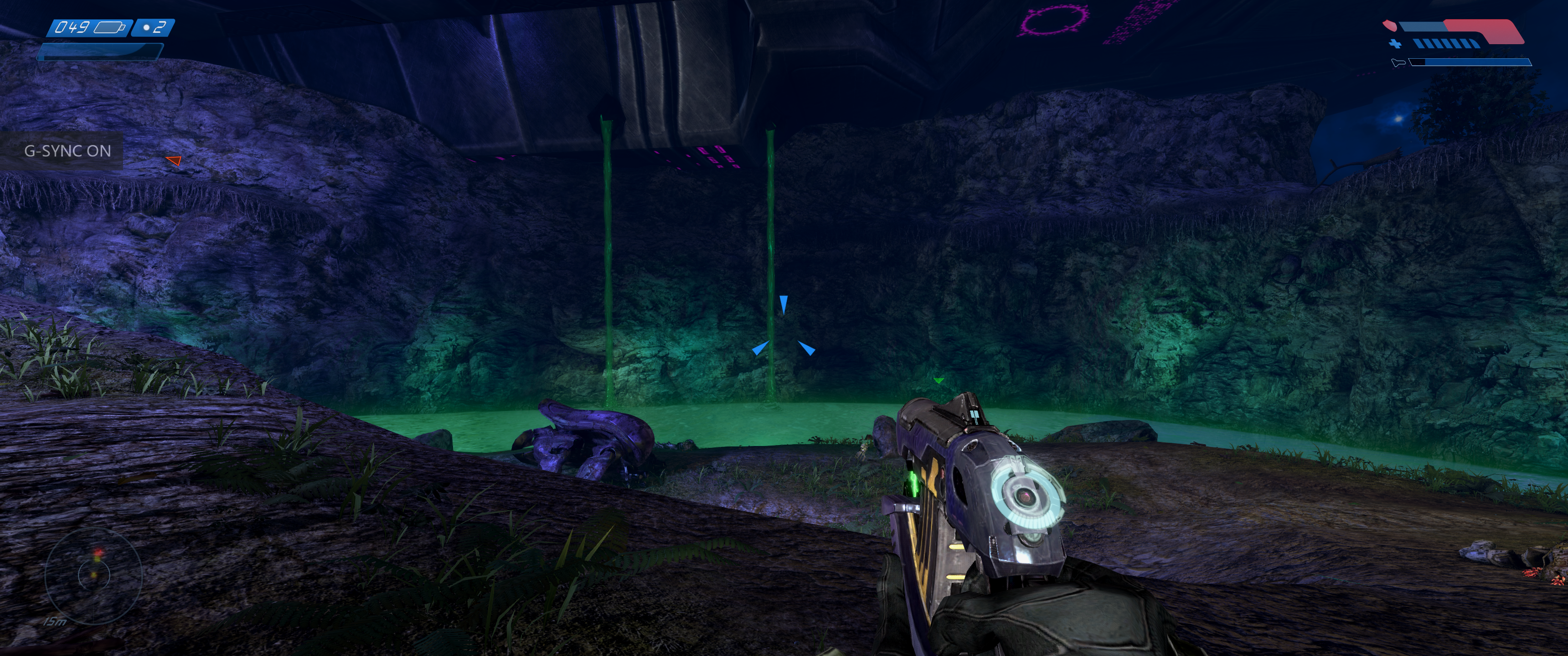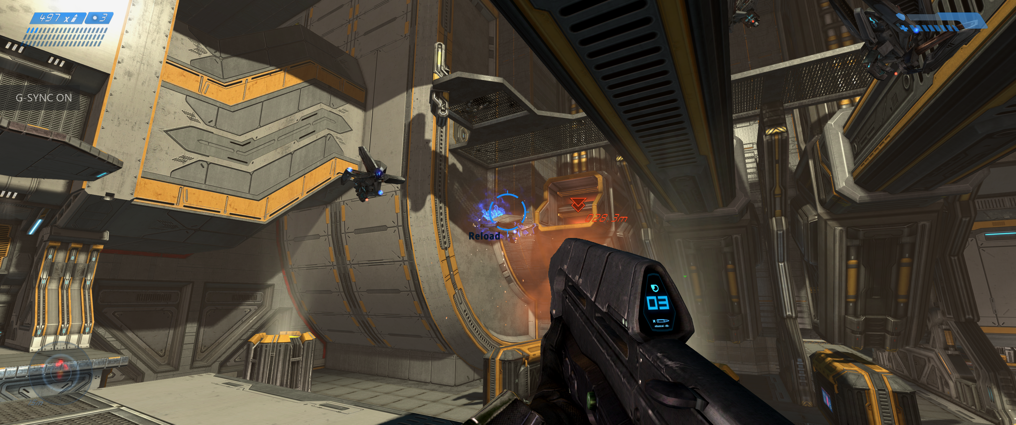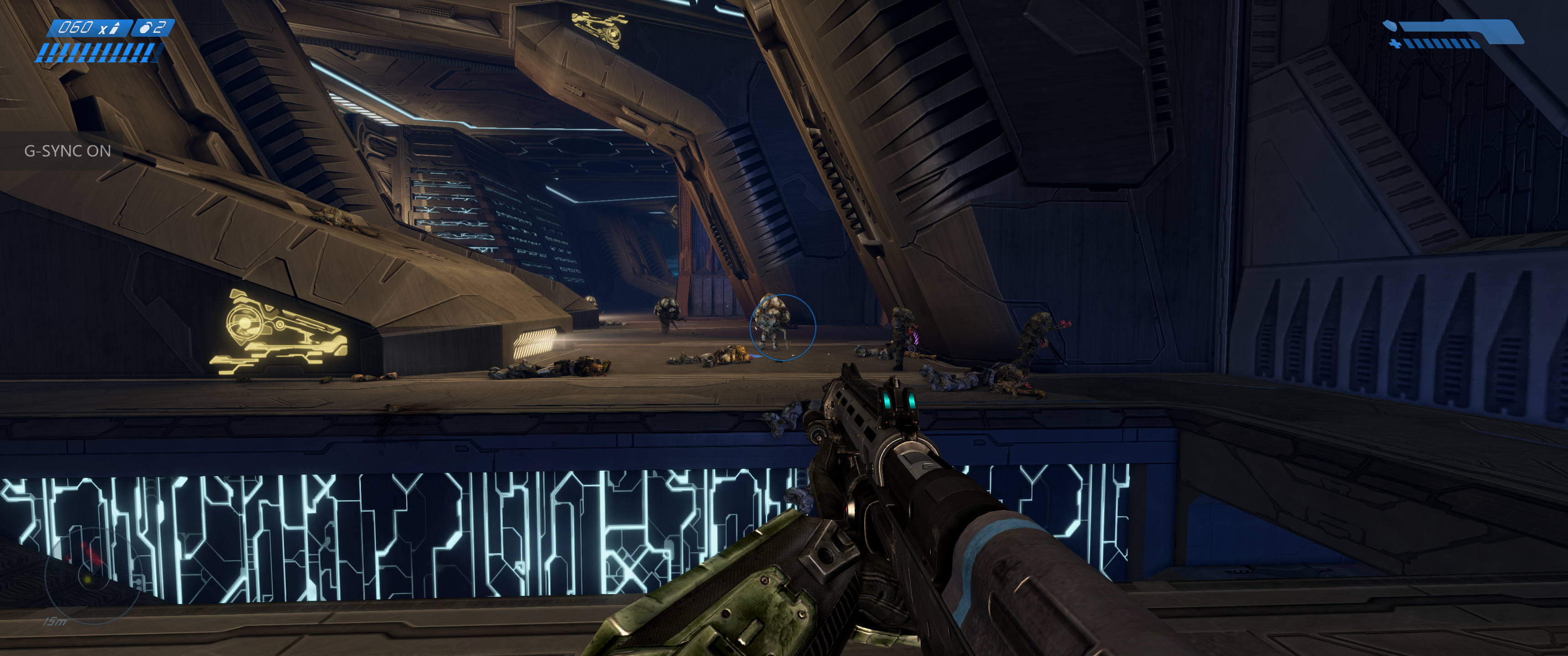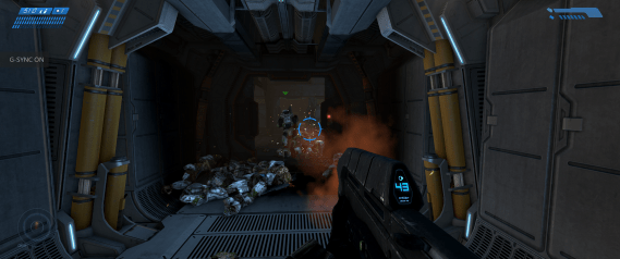 Much like Reach enjoyed as part of the PC Master Chief Collection, the OG Halo supports ultrawide resolutions and adds some graphical flourishes on top of the existing graphical presentation. In this case, however, the port in question is based off an existing remake: 2011’s Combat Evolved Anniversary. So that release’s most mind-blowing feature – the ability to switch between the original Halo visuals and the remade assets – survives the transition with some rather bizarre results. Not only can you now play the first Halo game in an aspect ratio almost twice its original width, but in a few interior locations the newer lighting effects layered on the old textures give proceedings a uniquely grim and foreign atmosphere. These moments arguably work better than they do with the new graphics to establish the foreboding mood surrounding an unknown alien installation.