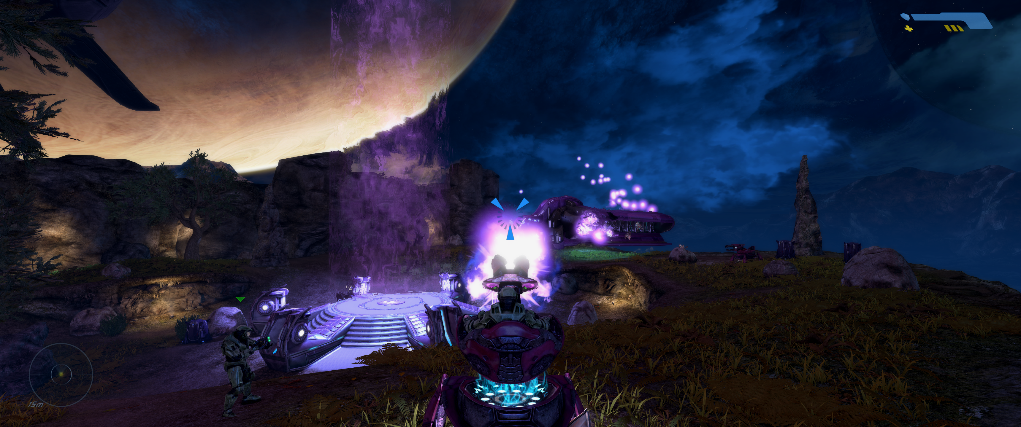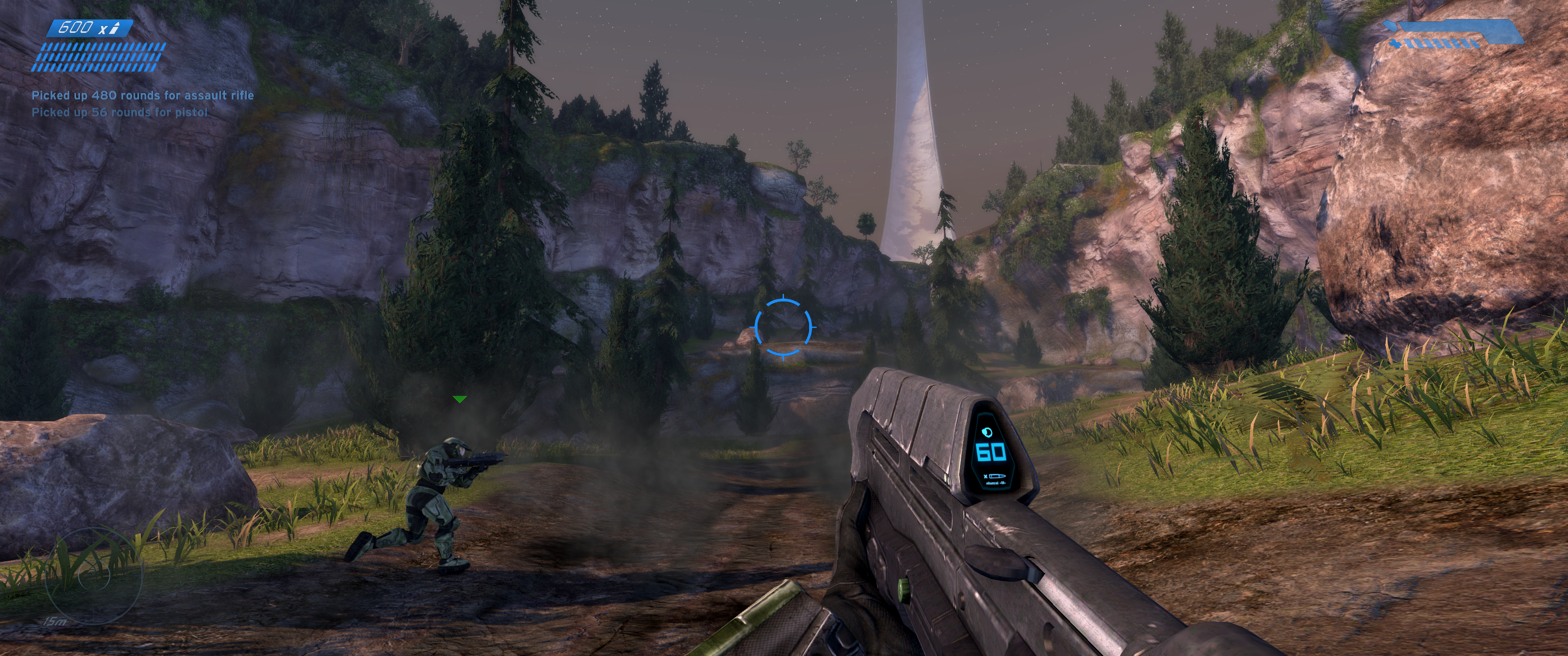 That said, it often feels a bit like blind optimism. That aforementioned lack of minimap was a progress killer back in the day and without my patient friend along for the ride this time, it may have struck again. Sprawling outdoor maps packed with exciting enemy encounters would become a real strength of the Halo series over time, but in the first entry it’s clear there were strides still to be made. Straight after it has opened with one of the most trailblazing first levels in gaming history, The Pillar of Autumn – an early-millennium example of tutorial and storytelling rolled into an accelerating ball of concussive gameplay – Combat Evolved has our Chief crash land on the Halo ring with an expansive mass of pretty rocks and grass. He must locate the escape pods containing his comrades, but with next to no indication of where the first one is, the player is expected to wander around until the shooting starts again. In 2001 this would have felt overwhelming in a mightily impressive way, but even with the updated ambience, it only feels dated nowadays.