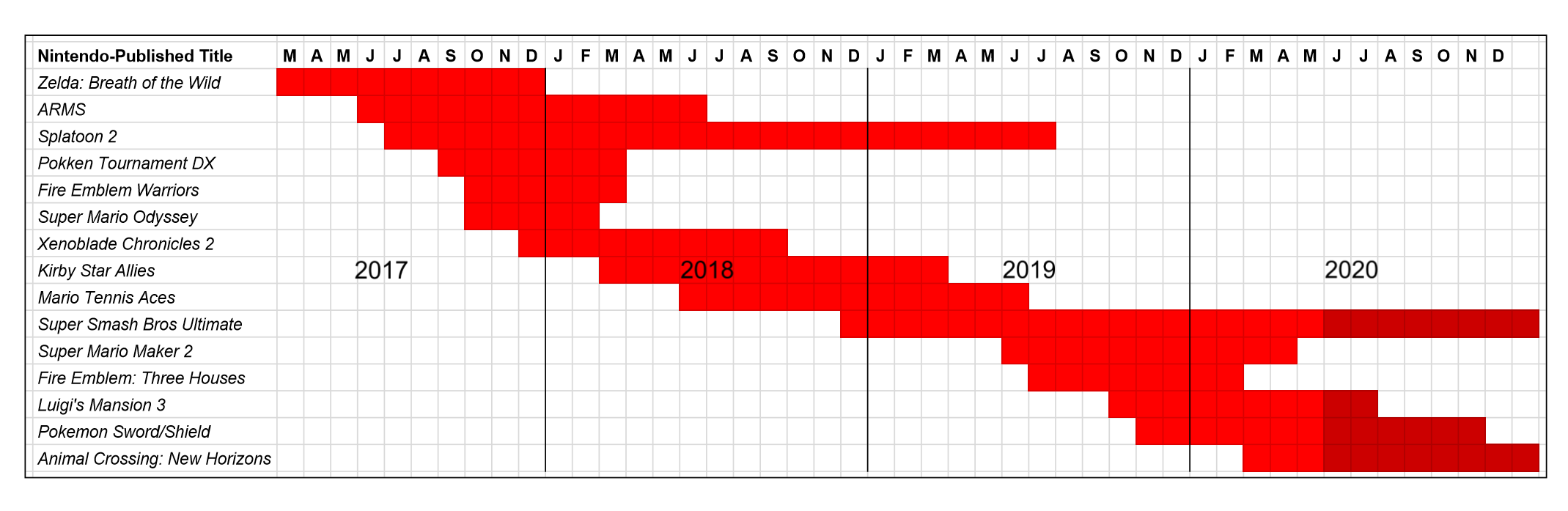 But there’s still something truly next-level about the company’s current attitude. For all the philosophical implications it carries, Nintendo is no longer afraid to improve its videogames after they have launched. Since July 2017, when the Switch was just four months old, Nintendo has been juggling ongoing content support for at least three major first-party titles at any given time – and often more. Such a level of commitment was simply unheard of before the Switch. I put together (with some difficulty) the following rough graph to illustrate what we’ve been dealing with. Each bar represents the period of time from a first-party game’s release date to it’s final piece of meaningful DLC. As much as it pains me I’ve excluded Labo VR add-ons in that categorisation, and releases lacking any DLC are also ignored (The dark red section is based on official promises for the future, but unlike half my Animal Crossing friends I am not a time-traveller so I can’t be certain). Click to expand if you need: