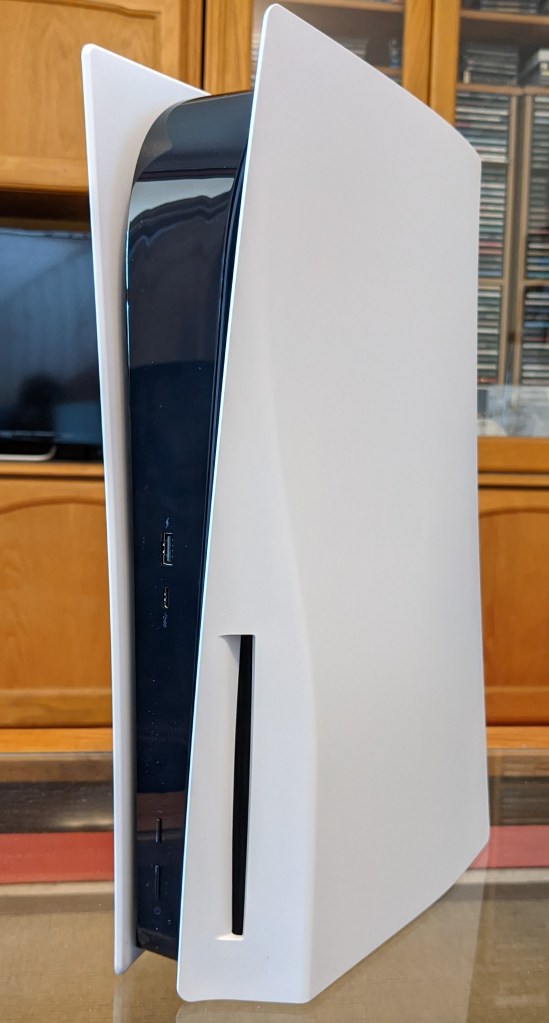 Visually the PS5 looks like it belongs firmly in the middle of the 2000s, right next to the lightly-toned, vertically-marketed day-one model Xbox 360 and Nintendo Wii. Despite being larger than both combined, it would’ve fit right in among that semi-space-age design trend. It marks a huge departure from the last decade of flat, straight black lines that aim to draw attention away from the consoles they adorn, arriving instead with a weighty form factor wearing a brilliant white coat, collar popped like it was made by a company that just sold 100+ million PS4s. It doesn’t care that it needs a chunky (included) stand for stability; it wants to be the first thing anyone looks at in your living room.