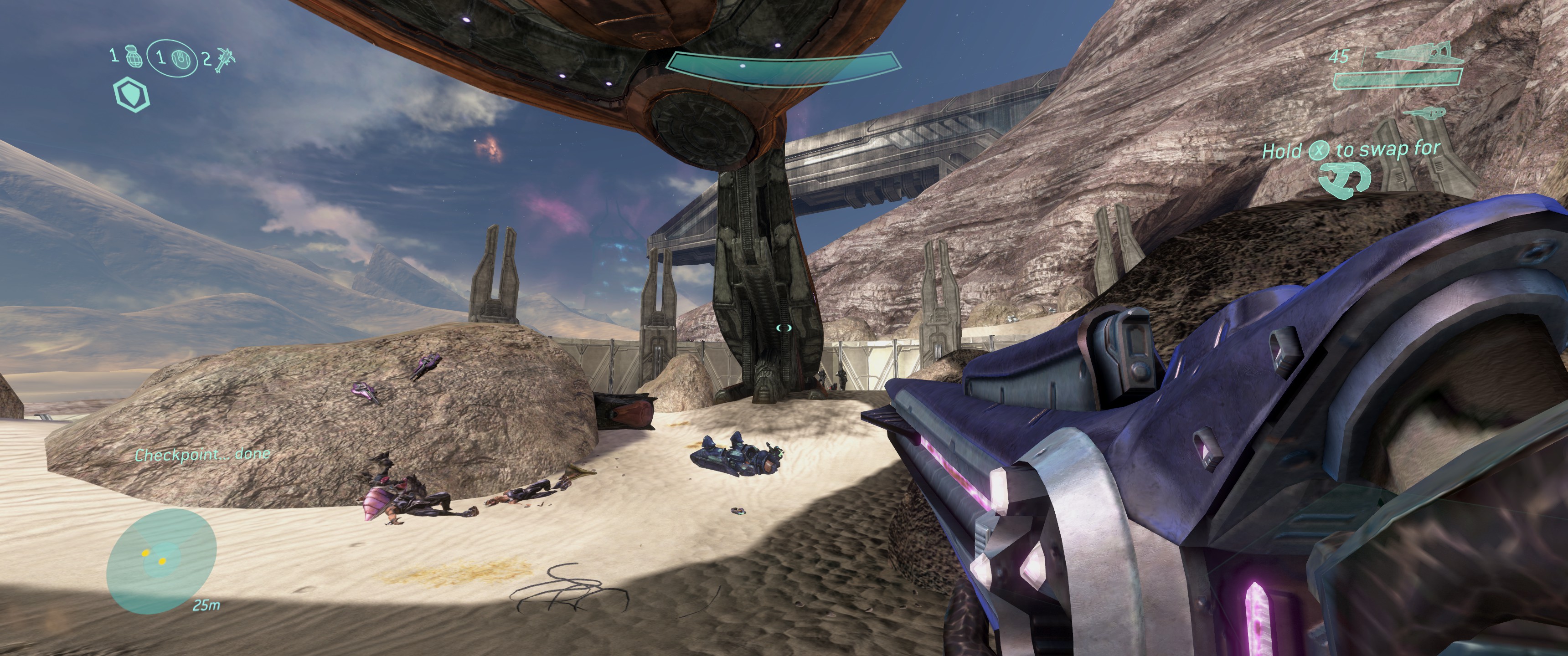 More recent Halo games may have refined or expanded the formula even further, but playing 3 feels comfortable; every piece of the physics engine feels like it was tuned with confidence. The punch of almost every weapon feels substantial and worthwhile, particularly right after playing Halo 2. The weapon sits lower on the screen than any of the other PC titles thus far, allowing for a wealth of visibility. Dual-wielding returns but feels like just another option, rather than the occasional necessity it was before. We’ve gone from two to four possible grenade types, and the weapon selection is a comparative embarrassment of riches.