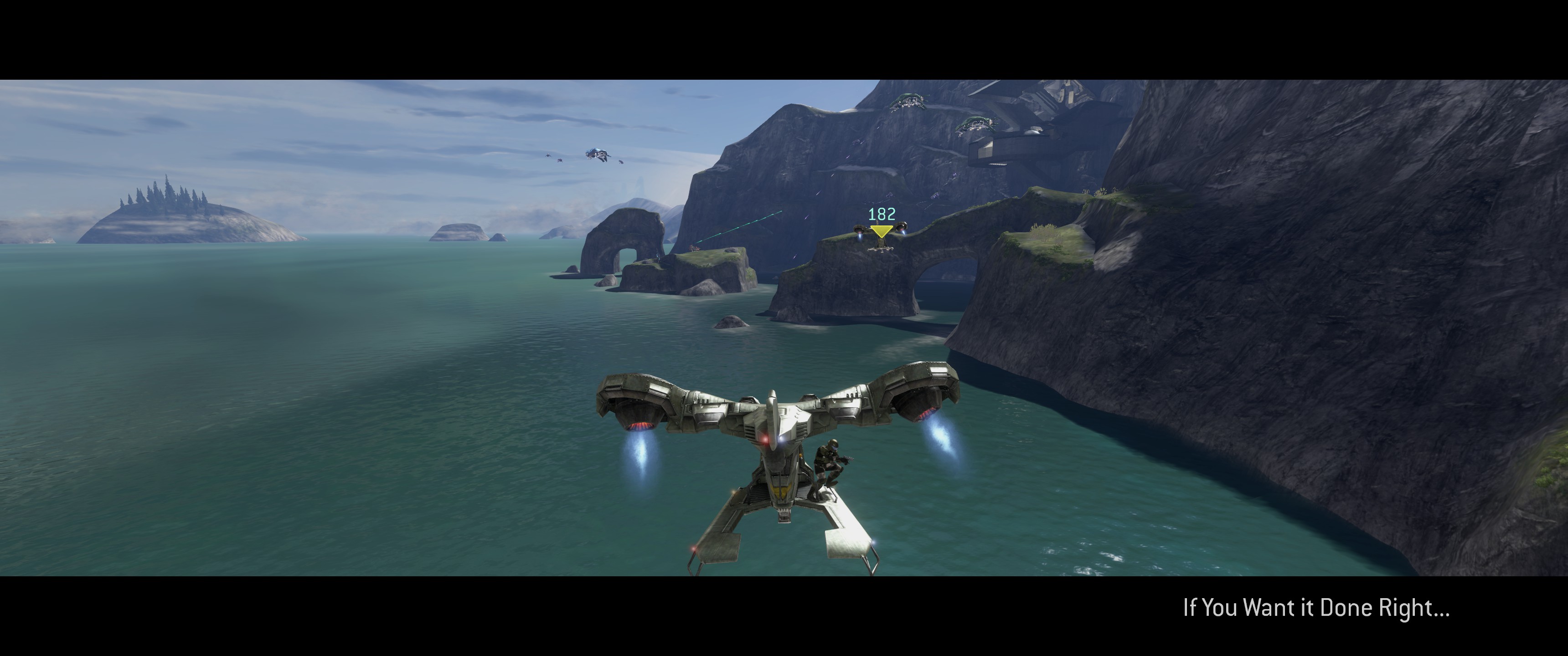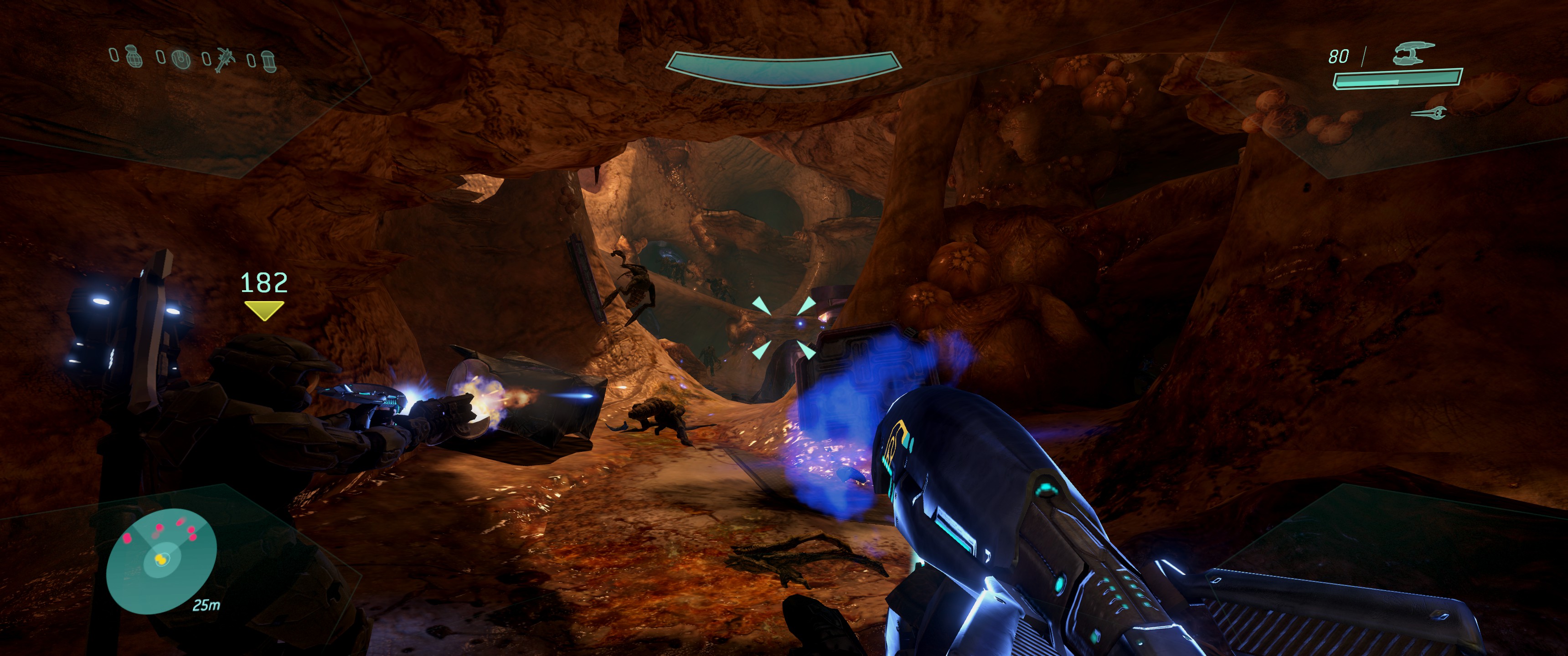 That’s not a bad thing: it’s definitely not technically the longest; my mate and I didn’t actually get stuck like we did at points in the last two games (thank you objective marker!) and there’s far less environmental repetition in the levels. But the game is certainly not shy about signalling a shift between areas and story beats by bringing up cinematic black bars every couple of minutes, cleanly emblazoning a pithy line of relevant wordplay while the next bit loads. The flow of the gameplay feels a tad stifled at times as a result, but the main effect of this technique is an added sense of momentum to the ever-shifting story. Halo 3 feels EPIC.