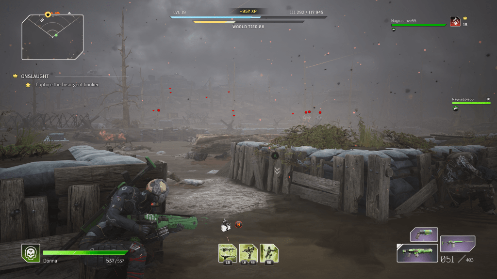 Then it happens: the dingy, muddy push up a fog-drenched incline laced with sandbags and barbed-wire towards a bunker that seems intent on raining fire down upon you and your companions. The bullets fly fast and frequently from slowly-encroaching behemoths, making each new piece of cover you reach feel like a gift – and each sprint feel like madness. Though your sight-lines are massively impaired, the open air allows plenty of room for all four Outriders classes to flex their unique skills and playstyles, making a co-op run ridiculously satisfying as you flank and dismantle your considerable opposition. I haven’t felt this tense in a looter-shooter since the first raid of the first Destiny.