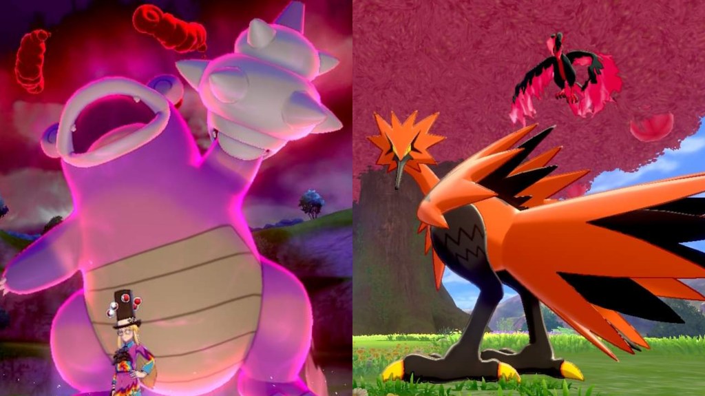 A mix of brand new creatures and truly inspired regional variants of older Pokemon – some now packing the ability to evolve into entirely unprecedented beasts – enhance the region’s character immensely: there’s a Dickensian grunge to the likes of Corviknight, Coalossal, and the Galarian forms of Weezing and Stunfisk; a whimsical Enid Blyton bent to Greedent, Alcremie, Hatterene and Boltund; a strangely compelling combination of both with Grimmsnarl, Stonjourner and Polteageist. Runerigus and Cursola bring the patented Pokemon ‘dex entry horror, Snom brings the memetic adorability, Barraskewda is endearingly goofy and insanely fun to use in battle, but my personal favourite thematic line is the glam Brit-rock stylings seen through Rillaboom, Toxtricity and my boy Obstagoon. Cracking stuff.