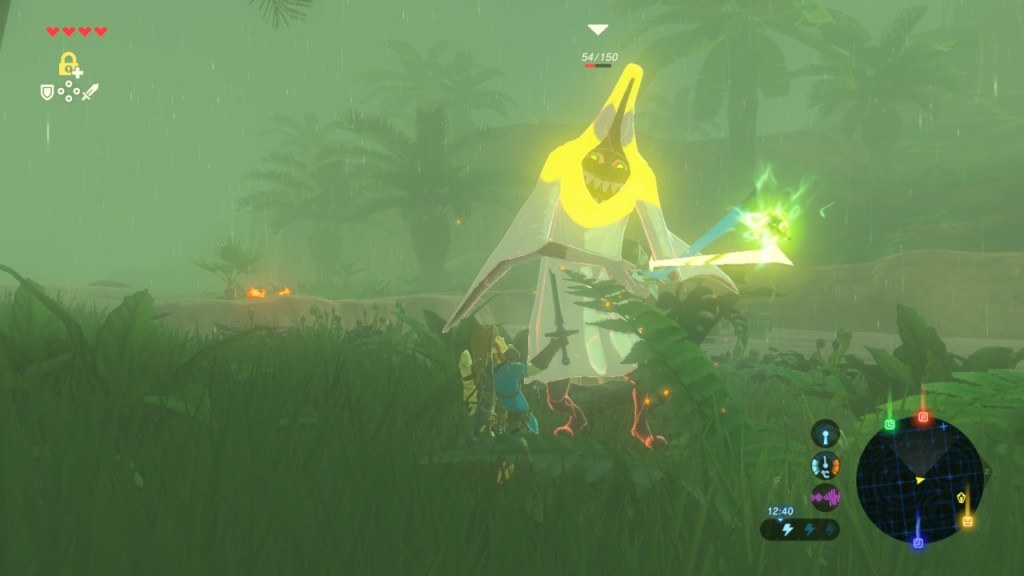 To the west I went, and before long it was clear I’d be spending several hours in the green tropical haze of Faron. This isn’t so much of a single moment as a collection of them: my first encounter with an (entirely unexplained at the time) enormous serpentine dragon; plenty of well-hidden shrine puzzles and interlocking lore; a new appreciation for electricity-resistant equipment in videogames thanks to a million storms and the Zelda franchise’s most consistently annoying enemy type, the Wizrobe; Zora references that hit me different because I hadn’t yet been to their city; all good stuff. Except for climbing in the rain. That sucked.