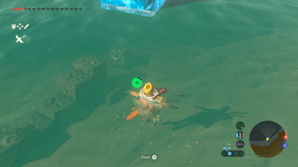 Here’s the other Korok seed that sits alongside the early forest pinwheel in my long-term memory banks – for an embarrasingly similar reason. You see, I was convinced this east-coast steel Magnesis block puzzle was bugged or something, because I was dead-sure the free block needed to slot neatly into that recess on the left so the shape was close to symmetrical. I can’t use the same excuse here as I did for the earlier airborne barrel; I knew every seed of this kind was based on matching a metal shape to its nearby reference point. But by now I had been in the groove of playing Zelda daily for weeks, and that day had been particularly long. I was simply too cooked to realise this was the reference shape, and the deficient one was just behind me on the shore. No, I won’t tell you how long it took me to work that out.