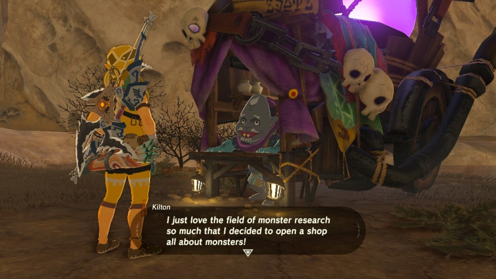I kept mostly ahead of any inventory dramas throughout my playthrough, because I had well and truly bought into the idea of using weapons as consumable resources and I was seeing out-of-place landmarks leading to Korok seeds everywhere. I was well en route to finishing above the 300 mark needed to max out all space upgrades (I was utterly floored when a mate later posted a progress screen with all 120 shrines complete, yet Korok numbers in the mid twenties – this game sure is many things to many people), but there was one thing still bothering me about the inventory system. Aside from dyeing, selling or occasionally cooking, it didn’t really feel like certain dropped monster parts had any real reason to exist (It sucks I don’t have any room to talk about the good times those mechanics gave me, just quietly). Then, on a rocky crag, I came across Kilton’s balloon-powered kit shop, and the potential of BotW’s economy was immediately laid bare. By now a few of my friends had begun to talk about the game almost like a Monster Hunter title, spinning tales of perilous trials in pursuit of building the rarest of armour sets. Though the thrill of early-game danger was long gone for us, there were plenty of reasons to keep exploring Hyrule yet.