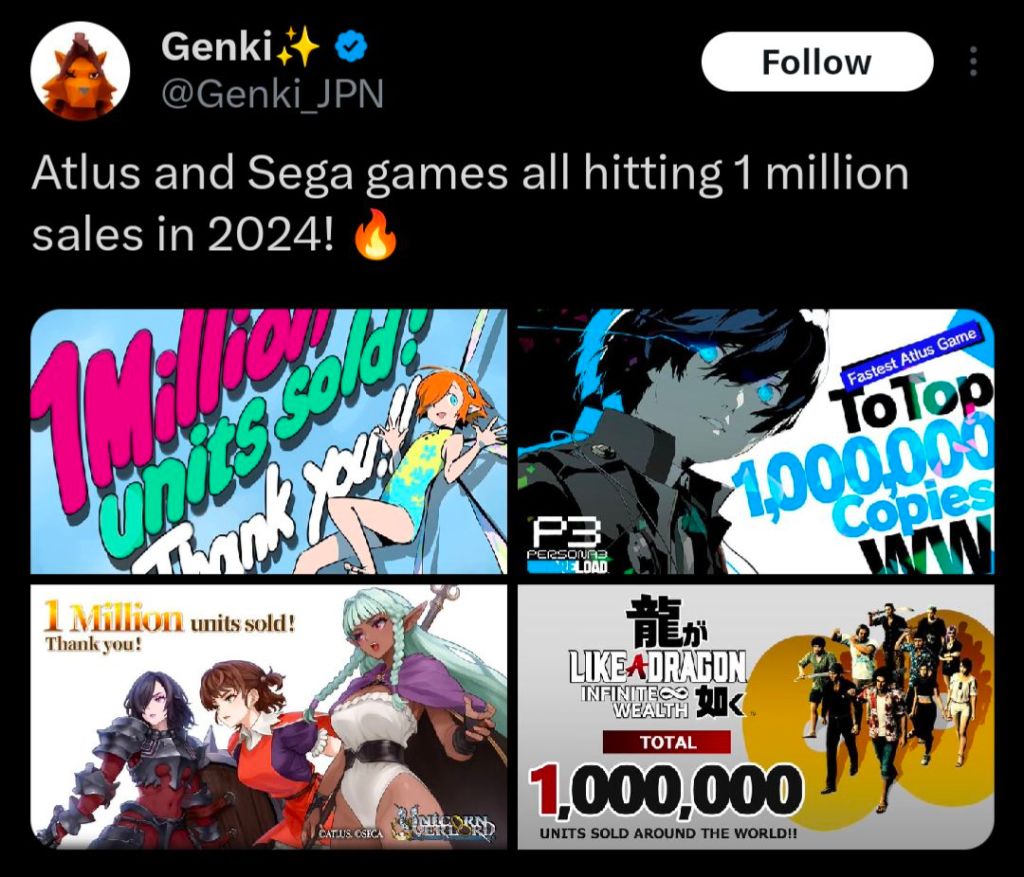 The internal corporate sales expectations of the world’s biggest videogame publishers remain largely opaque to us regular folks, but in a world where compatriots Square Enix have become a meme for repeatedly broadcasting to the world how disappointed they are with the millions their newest Final Fantasy title has sold, it must be said that Sega’s social media and PR teams kind of nailed it this year. When four of their 2024 RPGs (three of them Atlus) reached a million global sales units, the company celebrated each achievement publicly with special artwork; when July’s Shin Megami V Vengeance reached half that number in its first weekend, Sega still openly shouted that out with a press release. While the videogame industry is famous for keeping budgets close to the chest, if nothing else it’s clear Sega is pretty chuffed with the recent work of House Persona.