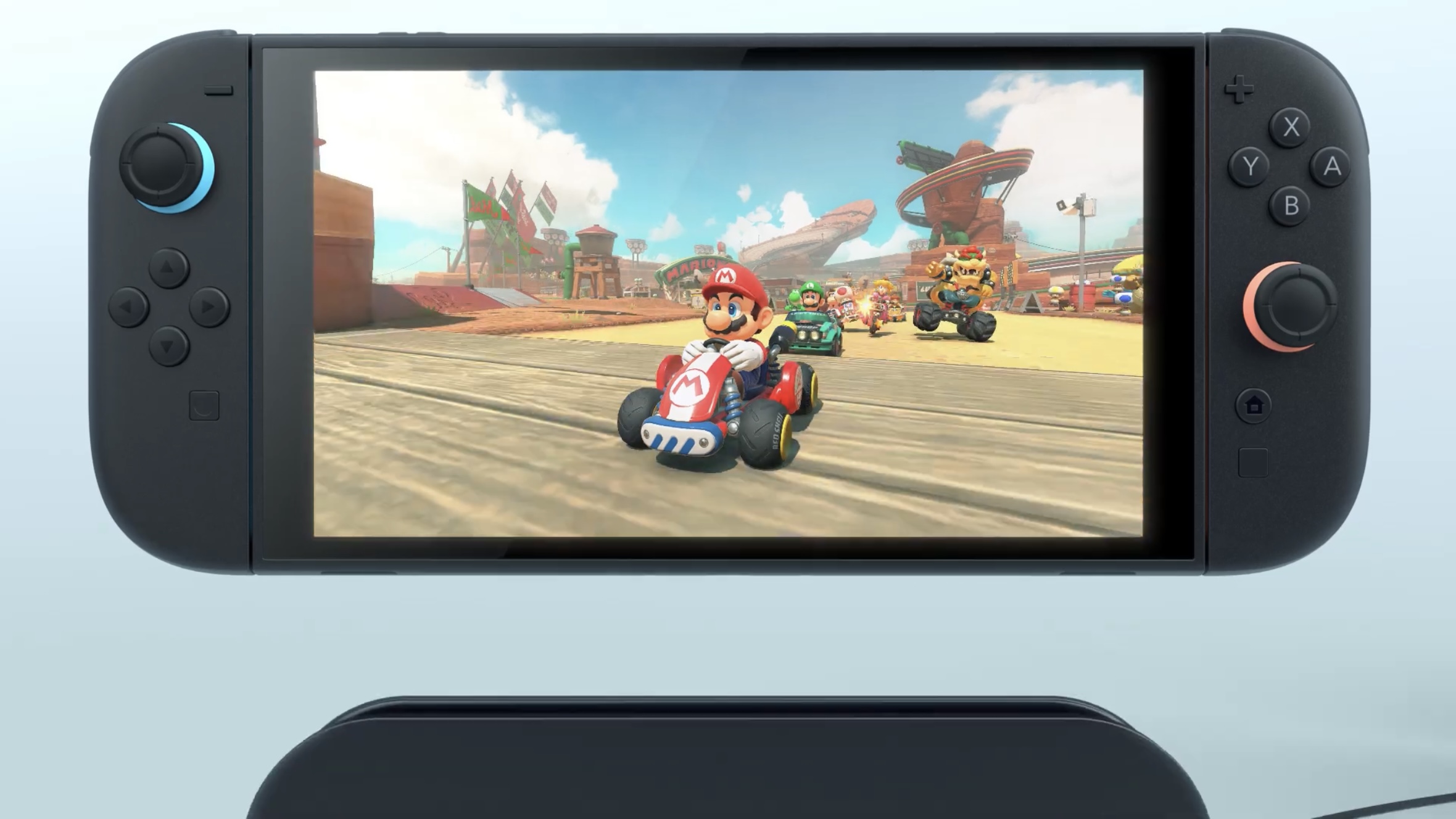 Whether the single videogame glimpse from the Switch 2 trailer will bear the title Mario Kart 9, Mario Kart X, or (my favourite theory) simply Mario Kart, its presence makes it extremely likely to be a Switch 2 launch title, and the game brings along some exciting changes to the franchise. First and foremost, the new character art style is an instant hit with me: from what we can tell, the characters all share a wider, more rigid look that immediately calls to mind the sprites from the very first Super Mario Kart and its immensely influential sequel Mario Kart 64; the clincher here is Donkey Kong’s throwback pre-Rareware design, which also seems to have taken on characteristics of Seth Rogen’s 2023 Super Mario Bros Movie look.