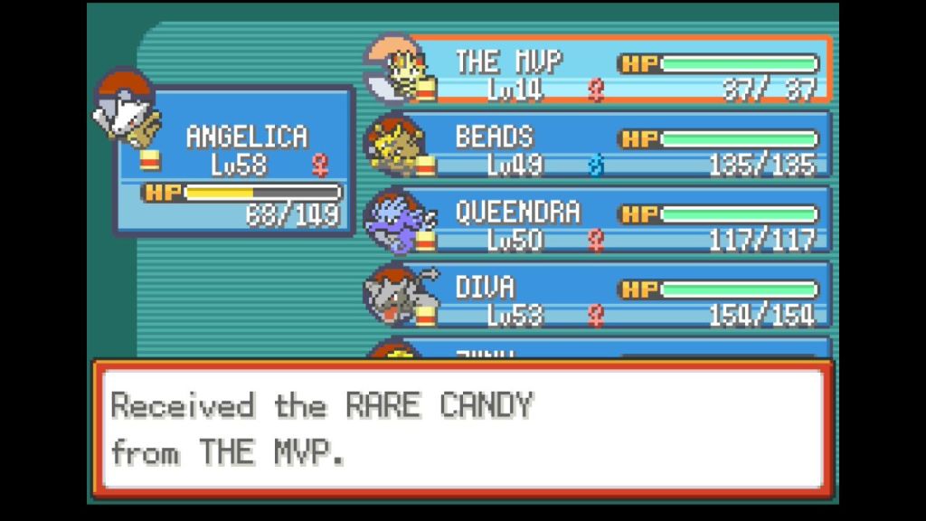 But then there’s Meowth, a Pokémon so suited to Fire Red’s specific set of mechanics that all three of the friends I played alongside also had it in their teams all the way through the game. Not only can Meowth learn both Cut and Flash, but the mechanics of the Pickup ability in FR/LG specifically mean it can avoid a single level-up and still provide multiple crucial PP Ups and Rare Candies to the party, with the odd useful Berry along the road and a “why not?” Hidden Power TM on occasion just to try out. After this playthrough, I am now of the opinion that everyone replaying these games needs one of these on their team for as long as possible; it just provides too much value, even without a single KO to its name.