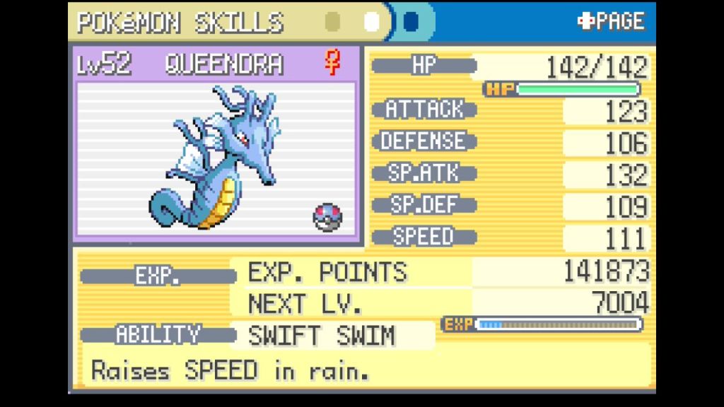 Seadra is sufficiently strong for the Gen I power level, and its Poison Point ability came in clutch more than a few times to secure KOs just out of reach of a single Surf. What’s more, the Blizzard TM I tossed its way seemed like it never missed whenever the team absolutely needed to rely on the move’s coverage benefits. Rain Dance helped keep Seadra’s Water power up against specially defensive threats, and ensured its post-game evolution wouldn’t be outrun by anything.