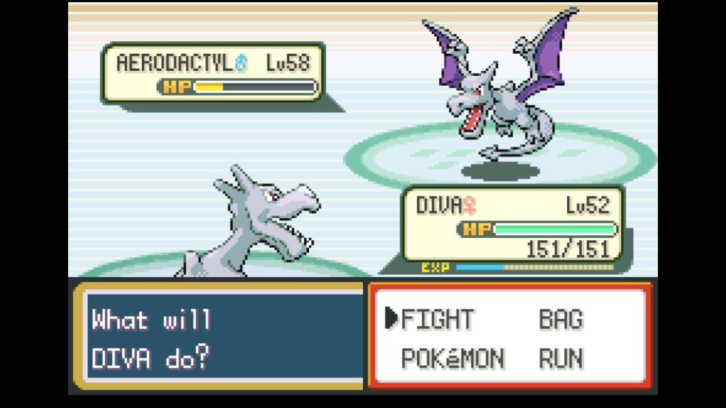 Charizard was my starter of choice, because I used Blastoise on that 2024 Game Boy Micro run and I’ve otherwise been all about Venusaur throughout my life. I also needed a mid-game Fly ‘mon, and the Kanto selection is so small that I had pretty much used all the other viable options on playthroughs before. My ‘Zard had a Modest nature, so it hit super-hard with Flamethrower but wasn’t going to be using the physical, 70-power Fly in battle particularly well. Good thing I only needed the move until late-game, because I also had my eye on another winged ally, and the first-ever fossil Pokémon to make my primary team for a playthrough: Aerodactyl.