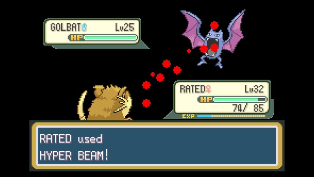 With the Dig TM for Rock coverage (and easy dungeon escapes), there were few opponents the rodent couldn’t take out over the duration of its time in the sun. I even gave it Hyper Beam when I got to Celadon to finish off Trainers’ final Pokémon; Gen III’s physical/special mechanics and Guts meant that satisfying animation came alongside a power level that often hit as hard as a Selfdestruct, and the experience even encouraged me to get recharge-turn moves onto my main Aerodactyl and Charizard sets as emphatic match-finishers.