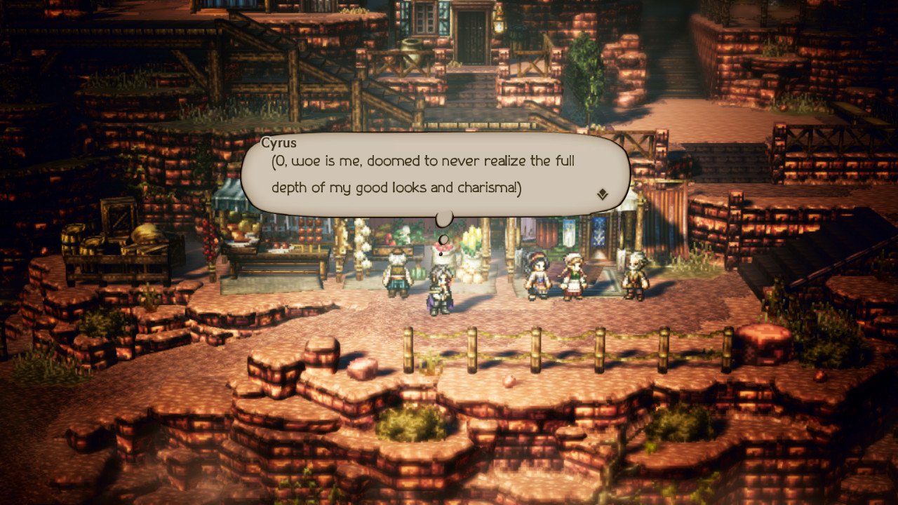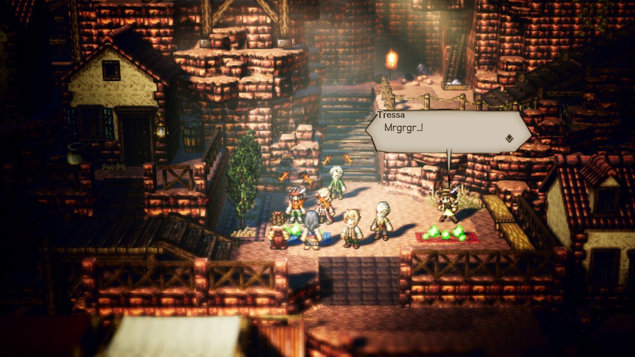 The game’s atypical approach to story structure – eight individual stories that stay separated from the wider party narrative outside of a handful of short optional skits – may irritate those who weren’t prepared to find such an approach in an RPG that appears so traditional at first glance. But as someone who has played a hell of a lot of JRPGs, I for one welcome the refreshing ability to tell some of the most focused, character-driven tales you can find in any title of Octopath‘s ilk. Bound by a less plentiful budget than is usually afforded to more known Square Enix RPGs, the game’s writers had to employ a simple combination of rudimentary animations, on-point musical cues and tactfully distributed voice acting to sell eight different four-chapter stories despite repeating a very similar contracted three-act structure 32 times.