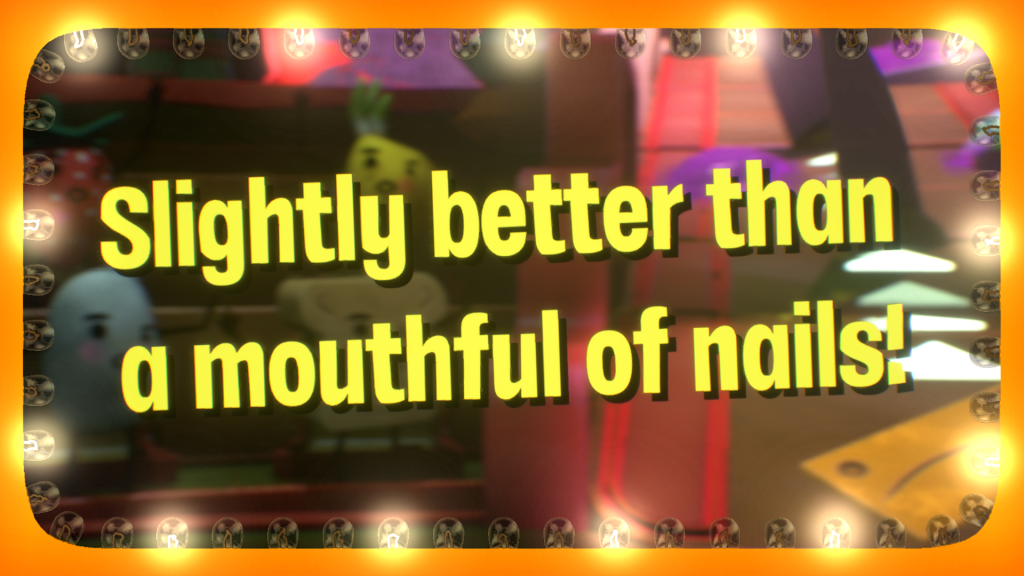 You’re given anthropomorphic ingredients to pluck from the audience and place in bigger anthropomorphic kitchen appliances – which you must reach within a strict time limit using precise platforming towards increasingly-difficult recipe requirements – all while a boisterous television host throws sly taunts your way. The sequence is frequently hilarious, decently challenging and a ton of fun.